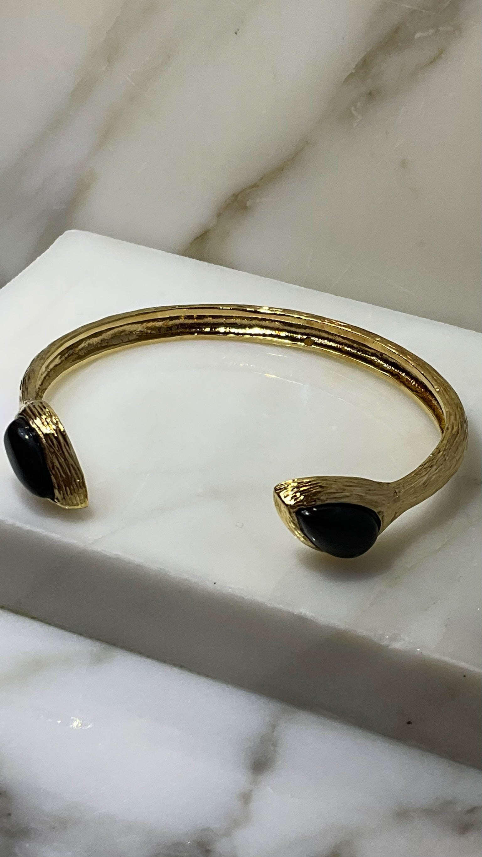A striking open cuff bracelet crafted in gold-tone metal with a textured, bark-like finish. Each end is capped with a polished black onyx cabochon, set into tear-drop shaped bezels. The interior is stamped with the AB hallmark (Alexis Bittar).